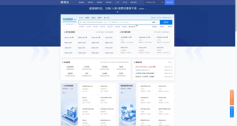 聚名网是什么? 聚名网是国内知名的域名交易平台,主要提供域名买卖、竞价和中介服务,聚集了大量已注册和优质域名资源。 聚名网可以做什么? 购买已注册的优质域名 参与域名竞价和拍卖 发布和出售自己的域名 通过平台完成域名交易与过户 适合什么场景? 项目或产品需要一个更好、更短或更有品牌感的域名 想直接购买已注册的成熟域名,而不是新注册 域名投资或二级市场交易 使用提示 聚名网以域名交易为主,价格取决于市场供需,更适合对域名有明确需求或预算的用户。
